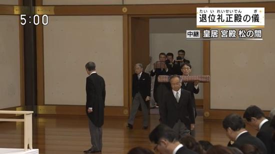 原标题:日本明仁天皇“10分钟”退位!御玺刻着中文,民众迎史无前例喜讯。。。 ► 编译 观察者网 郭光昊 当地时间4月30日17时(北京时间16时),日本举行明仁天皇退位仪式。明仁天皇现年85岁,在位超30年。 这也是日本天皇时隔202年实现生前更替。 明天午夜零点,“令和”将正式代替“平成”,日本开启新时代。 该仪式正式名为“退位礼正殿之仪”。仪式在宫殿“松之间”举行,仪式持续约10分钟,明仁天皇进行了极为简短的演说。 值得一提的是,为了庆祝新天皇即位,日本这个五一黄金周还特意增加了两天假期,形成了史无前例的10天连休。 仪式开始前,明仁天皇与手捧神器和玺的侍从首先进场,皇室成员随后。