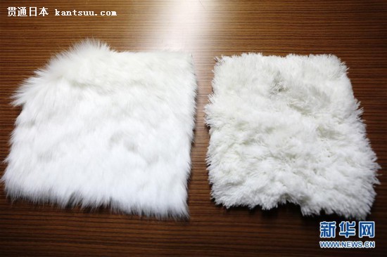 这是5月17日在日本和歌山县冈田织物公司内拍摄的人造毛皮成品(左)和拉毛前的材料。 新华社记者 杜潇逸 摄