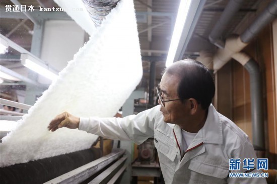 这是5月17日在日本和歌山县,与冈田织物合作的一间工厂负责人查看制作中的人造毛皮材料。 新华社记者 杜潇逸 摄