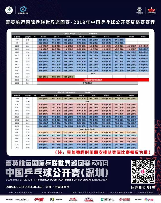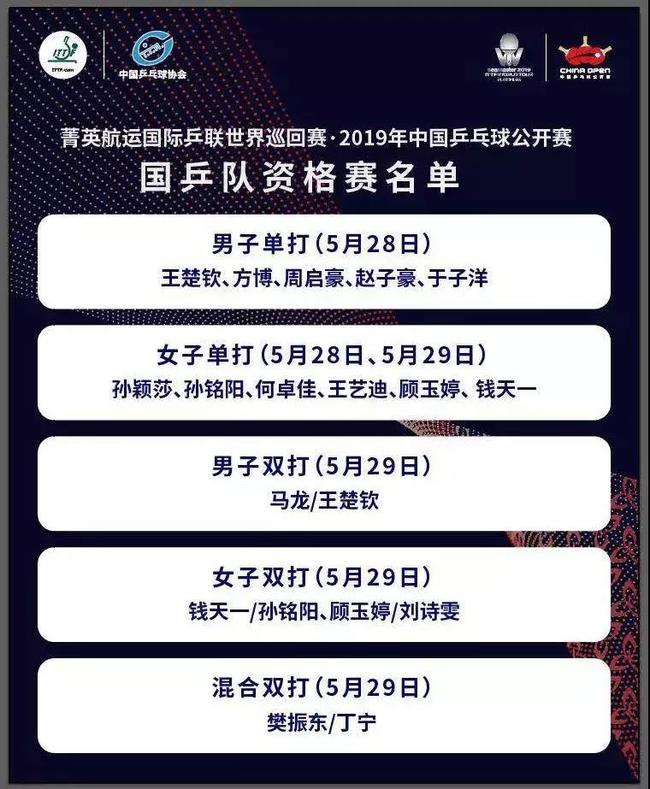 5月28日国乒赛程预告 9:00 于子洋VS马金宝(美国) 9:45 钱天一VS李清韵(中国香港) 12:00 王楚钦VS吉田雅己(日本) 12:50 周启豪VS待定 13:40 方博VS宇田幸矢(日本) 16:10 赵子豪VS阿库祖(法国)