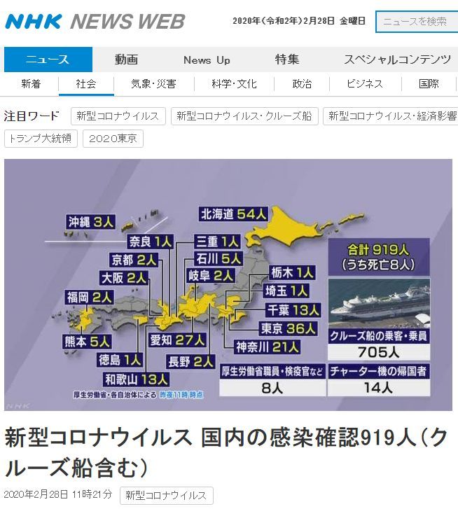 连日来,日本国内新冠肺炎确诊病例持续增加,感染范围包含了东京、大阪、名古屋这三大都市圈在内的19个都道府县。 截至2月27日晚10时,包括“钻石公主号”邮轮在内的确诊感染者已达919人(死亡8例),使得日本成为继中国、韩国之后新冠肺炎疫情蔓延日趋严重的国家。基于此,日本政府认为疫情已进入到扩大感染阶段,遂于2月25日召开新冠肺炎疫情对策本部会议,公布了以“尽可能控制感染扩散速度,尽可能减少重症和死亡病例”为目标的基本应对方针。 2月27日,日本首相安倍晋三要求全国中小学从3月2日起临时停课。不过,这一决定在全国引发热议,有些县市的政府对此感到不满,甚至公开指责安倍无权做出这样的决定,认为“停课是反应过度”。 民众担忧和恐慌来自何处? 那么日本究竟安不安全呢? 单纯从人口比重看,日本总人口超过1.2亿,国内感染者200人左右(不包括“钻石公主号”、武汉撤侨及在华日侨的确诊病例),而每日新增确诊病例也就是个位数而已。因此,很多人认为日本十分安全,目前的不安心理和民众恐慌更多的是媒体渲染的结果。 然而,真正令人担忧的是统计数字没有显现出来的社会隐性病患。那么是什么原因造成这种隐患的呢? △ 随着新冠肺炎疫情蔓延,日本的感染人数也在不断增加,在东京中央区,这几天街头戴口罩的人大大多于往常。图片来源/美联社 首先,关于新冠病毒核酸检测权限,日本政府将判断权力下放到了医院及保健所。但95%以上的日本医院并不愿意接受外来的检查,因为一旦发现感染者,医院的业务势必大受影响。而上述200人仅是对约1300人进行检查后的数据,更多的人并没有得到检查。 其次,日本政府认定感染疫情的标准是有出国史(主要指到中国武汉)和确诊病例接触史的两类人,只要没有满足政府的认定标准就不能接受检测,这就有可能导致很多感染者得不到及时的检查。如日本首位死亡病例是一位80余岁的妇人,她早在1月中旬就出现发烧症状,2月1日住院后也只按普通肺炎接受了医治,直到2月13日病故后才被检查确诊,而她最近并没有任何海外旅行的记录。 最后,在日本职场上存在一种风气,如果职员生病的话就会被质疑为不适合承担工作,因此在出现症状后带病持续工作的例子比比皆是。东京、千叶与和歌山都存在这样的确诊患者,他们出现发烧症状后,选择自行服用退烧药并持续工作,最终酿成重症甚至是转变为感染源。 此外,日本还出现了多个无症状感染病例。和歌山、爱知等多地也出现了尚未完全探明传染源的群体感染,且部分确诊病例感染时间为1月底至2月初。因此,这些人可能在过去的两到三周内已造成新的传染。加之,从“钻石公主号”下船的乘客中也隐含感染病例。正是因为这样,日本国立传染病研究所所长脇田隆字坦承,上述隐患导致日本“控制传染难度较大”。而日本政府也认为未来的一到两周将是感染高峰期。 目前日本政府的方针是只有成为重症病患才能接受治疗,而一般的轻症病患或者无症状病患得自行在家休养,靠自身的抵抗力求得痊愈。因此政府呼吁不符合条件的病患不要前往医院。 然而随着疫情的持续扩大,全国各地的医疗机构和保健所每天都接到大量询问新冠肺炎的电话,未确诊患者也大量前往医院。 民众担忧自己被感染却得不到检查,加之防护口罩的严重不足,使得日本社会的不安情绪正在与日俱增。 奥运会能否如期举行? 受此影响,先是日本宫内厅宣布取消原定于2月23日举行的天皇60岁生日大型祝贺活动。随后是神奈川县的川崎市规定,政府部门采取错峰上班机制,从2月26日开始将出勤时间分成7点半到10点五个时间段自由选择出行。此外,资生堂还决定从2月26日到3月6日,占全体员工三成的8000人采取住家办公的形式出勤,公司内部大小会议也将采取视频电话的方式进行。 上述不安情绪还进一步蔓延到了各种体育比赛和文艺活动上。如继日本规模最大的城市马拉松赛——东京马拉松决定大幅缩小规模举行后,日本政府也要求未来两周内举办的体育赛事和大型活动或“中止”或“延后”。 但相比之下,社会各界最关注的,还是原定于7月24日开幕的东京奥运会是否会受疫情影响而取消。
