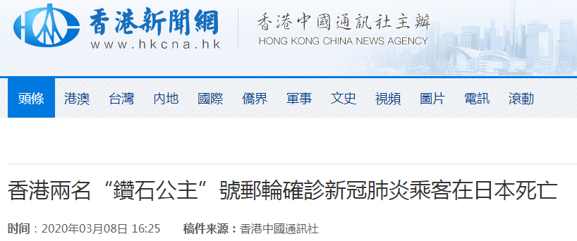 "钻石公主"号邮轮两名确诊香港乘客在日本去世