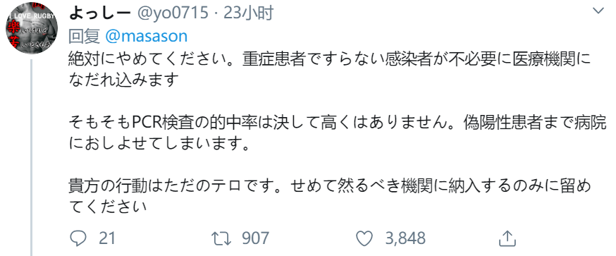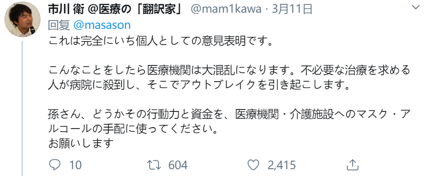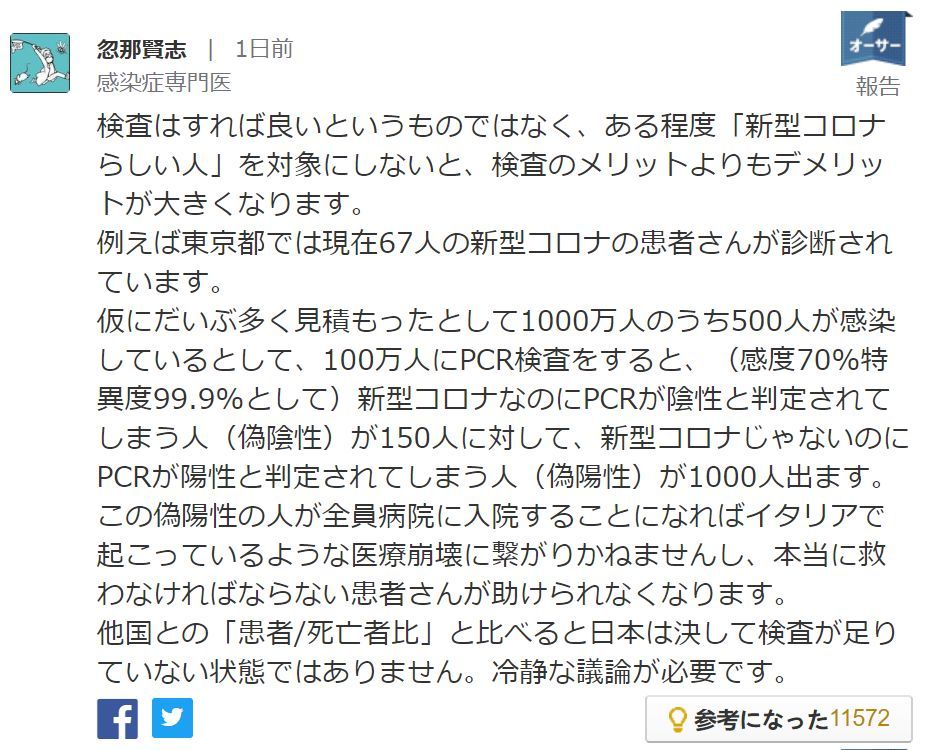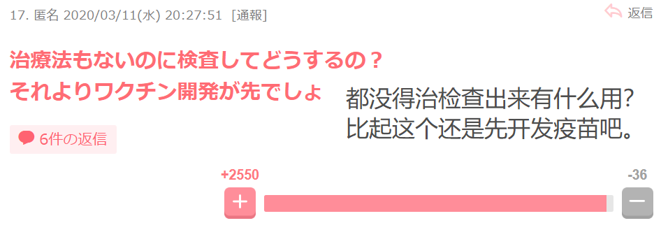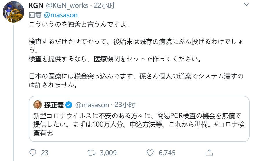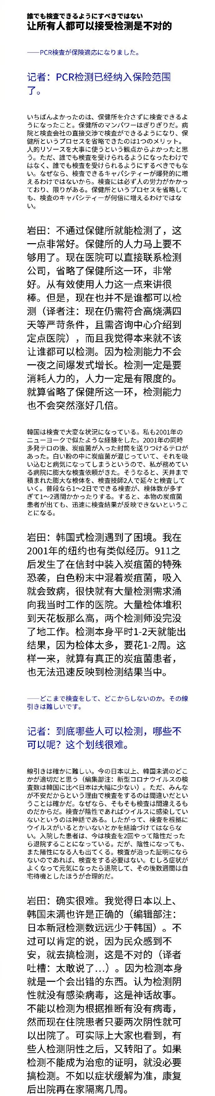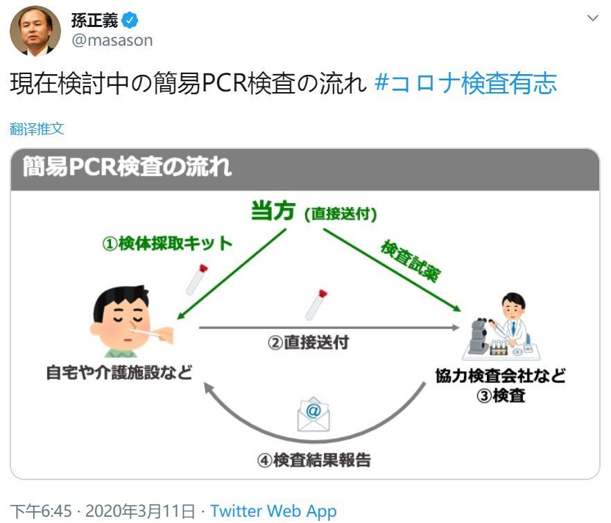 事情是这样的。 3月10日晚,日本软银集团社长 孙正义 时隔3年登录推特,表达了对日本疫情的担忧,次日上午表示,自己“要开始行动了”。 随后,孙正义在当天傍晚宣布,自己将免费提供100万份简易PCR病毒检测,帮助日本对抗疫情。试剂会直接分发给日本民众和检测机构,普通人测完之后可以直接寄送回去。 这引起了日本网友的强烈反对,甚至遭到指责。 01 被嫌弃的孙正义 大部分理性说话的日本网友,观点主要集中在“扩大检测范围会导致日本医疗体制崩溃,重症者将无法医治”上。 韩国、意大利的医疗崩溃,无法应对重症患者,反而导致死亡人数增加。PCR检查的假阳性概率很高,因此给医疗机构增加负担。关于这部分,请你说一下你怎么想的。 这就是所谓的自以为是吧。检查完了就扔给医院,要是想要提供检查的话,也请设定相关的医疗机构啊。日本的医疗已经上税了,绝不能因为孙桑的个人喜好而崩溃。 千万别。(这样的话)连重症都不是的患者就都不必要地涌去医院了,本来PCR的检测几率就不高,甚至会把伪阳性的患者送到医院,你这种做法就是恐怖活动。 当然也有些单纯抬扛的网友,完全否认孙正义的捐赠行为,称其多管闲事。 不过,也有不少医疗工作者表达了反对意见。 这样的话会引起医疗机构大混乱的,不必要寻求治疗的人都涌去医院,会在那里引起大爆发的。孙桑,请把这样的行动力和资金用在给医疗机构和看护场所安排口罩和酒精上吧,拜托了。 会造成医疗体制崩溃的,千万别这么做。 雅虎新闻的评论里也有实名认证的专家提出意见。 (比较长,就不逐字翻译了)这位专家打了个比方来说明PCR检测的不准确性很高,表示“检查的坏处比好处多”,“这么做的话会像意大利那样引起医疗体质崩溃的”,“跟其他国家的患者/死者比例相比,日本绝对不是检查不够的状态”。 面对如此强烈的反对意见,孙正义在2小时后表示,还是算了吧,撤回这100万份免费检测。 我听说有很多人想检查但是得不到检查所以才提出这个的,评价这么差的话,那还是算了吧。。。 在这里,孙正义说的“有人想检查但得不到检查”的情况,确实是存在的。 02 被拒绝检测的日本民众 日本有一位四个孩子的母亲,曾于2月21日在推特上发文,称儿子连续发烧咳嗽6天,去地区保健所要求医生给孩子进行新冠肺炎检测但被拒绝,理由是不在检测对象范围内。 前几天广岛确诊的首例患者,在2月上旬就出现了相关症状,去了4家医院,8次就诊,终于在20天后进行了第一次检测,最终确诊入院。 要知道,日本人平时去医院想做个什么检查是很简单的事。 只要医生点头,随时可以在医院做血液检测和图像检测, 而且基本都加入了保险,自己要负担的很少, 就算是CT这种在我们看来比较昂贵的检查项目,他们也只需要负担3成(不到1万日元)的费用…… 这样的待遇在世界范围看来都是很少见的。 但是这次新冠病毒的检测,门槛却高得不行: 必须要重症或者有海外旅行史的人才能检测, 必须得经过保健所, 必须自己负担检测费用……(没确诊的话) 这跟平时习惯了轻松检查的日本人认为的根本不一样。 之所以要这么操作,是因为厚劳省最开始做病毒检测,是为了进行“流行病学调查”研究,而不是对每位患者进行临床检测治疗。 他们希望通过锁定感染途径,对感染者、密切接触者和疑似感染等有关人员,进行精准的调查和检测。通过这些研究检测,得出更完整的病毒特性和传播方式的数据,最后在此基础上推出相应防控举措。 由于pcr检测的存在一定的误差,会影响日本人想要的数据准确度,所以,日本一直通过自主确立的检测手段来完成检测。 这样要做就做到极致的方式,可以说是很“日本”了。 但是日本政府并没有一开始就向普通民众传达这样的想法,普通民众和厚劳省的专家们对于疫情的认识,就此出现了偏差。 03 被质疑的日本政府 紧接着,世界疫情发生巨变,日本国内人传人案例的不断出现,感染不断扩大并未平息,日本民众越发不安,就更不能理解官方要求的“做病毒检测必须经过保健所”这一点了。 这时候,隔壁韩国大力推行检测,且效果显著,在这样的对比下,日本民众的情绪近乎到了临界点,网上甚至出现了“日本政府试图通过减少检测数让感染者人数看起来更少”的舆论。 对此观点,负责PCR检测的国立传染病研究所,3月1日在官网做出了反驳。表示自己正在进行“积极的流行病学调查”,而且没有阻挠病人做检查的意思。 之后,面对民众的质疑压力,厚生劳动省也有做出调整。 自3月6日起将新冠病毒检测费用纳入日本医疗保险范围。今后可由医生决定是否对患者进行病毒检测,就不用事先申报保健所同意了。 从数据也能看出,厚劳省做出调整后接受检测的人明显增多了,即使与其他国家比起来差得远。 既然存在检测难情况,那为什么网友还要反对试剂捐赠? 因为试剂捐赠和日本现在的检测难,其实不是一回事。单靠捐赠试剂是解决不了的,检测涉及到医疗资源的分配、确诊患者的后续治疗方案、检测期间是否会增加交叉感染风险等等。 那到底要不要检测呢? 3月12日,知名刊物toyokeizai采访了岩田健太郎教授。(对,就是那位发推特怒斥日本政府处理钻石公主号不当,被称为“日本吹哨人”的那位) 04 到底要不要检测? 采访里,岩田教授也表示“让所有人都可以接受检测是不对的”,具体原因请看下图。