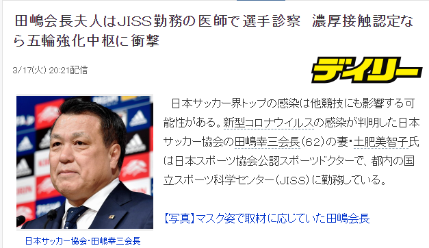 ![]() 3月17日,日本足协主席、日本奥委会副主席田岛幸三(田屿幸三)被诊断出感染了新冠肺炎之后,在日本足球界和体育界引起了恐慌。 日本足协的官员表示,田岛幸三在2月28日离开日本,前往欧洲和美国进行了一系列的活动,还参加了为日本申办女足世界杯的宣传会议。 他首先在3月1日于北爱尔兰的贝尔法斯特参加了国际足球协会理事会(IFBA)的年会。3月2日和3日在荷兰的阿姆斯特丹,作为国际足联执委,参加了欧足联的执委会以及第二天的欧足联全体会议。 随后3月4日,田岛幸三转而前往美国的奥兰多,观看了日本女足和西班牙队的比赛。并且在纽约参加了2023年日本女足世界杯的宣传申办活动。 3月8日,田岛幸三返回了日本,在日本国内参加了日本足球协会的多个会议,包括日本国家队因为疫情进行的赛程调整等。 3月14日,田岛幸三感到自己出现了发烧的情况,随后在16日前往东京都文京区的保健所进行了检查,17日发现他的检测结果呈阳性。 田岛幸三通过工作人员表示:“在欧洲的时候,没有感觉到当地对新型肺炎的紧张,大家互相拥抱握手都很自然,而美国也没有现在的这种紧张感。 虽然检查出了新型肺炎阳性,但是目前我除了有点发烧外,情况还算良好,让大家为我担心了。” 日本的《体育日报》报道说,田岛幸三的感染,有可能会导致整个日本奥运军团都中招。因为田岛幸三的妻子土肥美智子是日本体育协会认证的体育医生,目前在在东京都的国立体育科学中心(JISS)工作。这相当于北京中国国家体育总局训练局边上的体育医院。 JISS就在日本东京味之素训练中心(NTC)的边上,很多日本参加奥运会的选手,比如乒乓球、羽毛球(羽毛球队此前已经离开日本出国)和体操等都在这里训练。土肥美智子作为内科医生,和日本的奥运选手接触是很正常的事情。如果她被认定是密切接触病原者的话,日本可能不需要政府宣布奥运会延期,本身比赛就没法打了。 为此,管理JISS的日本体育振兴中心关系者说:“目前正在对她进行确认中,如果是密切疫情接触者的话,将会根据指示进行对应,我们肯定会对每一个人进行严格调查的。”(周超) |