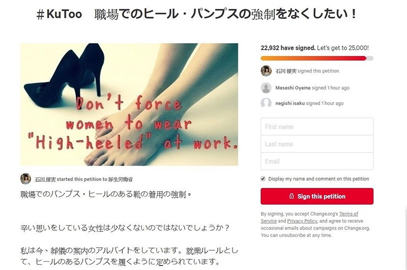 除了高跟鞋,2019年7月,日本航空还发布了首批女性专用的“裤装”制服,一时间也成为了热门话题。 其实不仅在空乘行业中,酒店、餐馆、百货商店等各种行业里都有类似“女性必须穿高更鞋”的着装规定,甚至平底鞋则会被认为是“工作的疏忽、不认真”的表现。因此2019年,一场呼吁职场女性摆脱高跟鞋痛苦的“#KuToo运动”在Twitter上兴起。 #KuToo运动兴起始末 日本写真模特、自由作家石川优实是“#KuToo运动”运动的发起者。起初,她只是受“#MeToo”运动的影响,回想起了自己在工作时,被公司强制要求穿上高跟鞋的痛苦时光。她忍不住在推特上抱怨了一句,没想到瞬间收获了许多网友的响应。随后,石川便发起了一场名为#KuToo的活动。 2019年,石川优实发起了实名请愿书,向日本政府呼吁禁止雇佣者强迫女性穿高跟鞋,请愿活动收集到2万多个署名,并于6月3日提交至日本厚生劳动省。 石川在接受采访中表示:“并不是希望大家仇视高跟鞋,而是希望日本的职场女性有选择穿还是不穿高跟鞋的权利。”