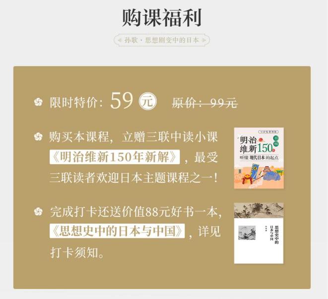 限时福利 限时特价:59元 原价99元 购买本课程立赠三联中读Top3小课 《明治维新150年新解》 完成打卡送价值88元豆瓣高分好书, 即孙歌老师著作的《思想史中的日本与中国》 课程亮点 01 解读六大思想家,看日本战后思想精髓 战后,诺曼自杀事件掀起了一场巨大的风波,这场风波刮过日本全境,带来了一场场热烈的讨论,也给思想家们提供了一次审视自我、审视外界的绝佳机会。主讲人将借此契机,带你一窥日本战后思想的核心地带。