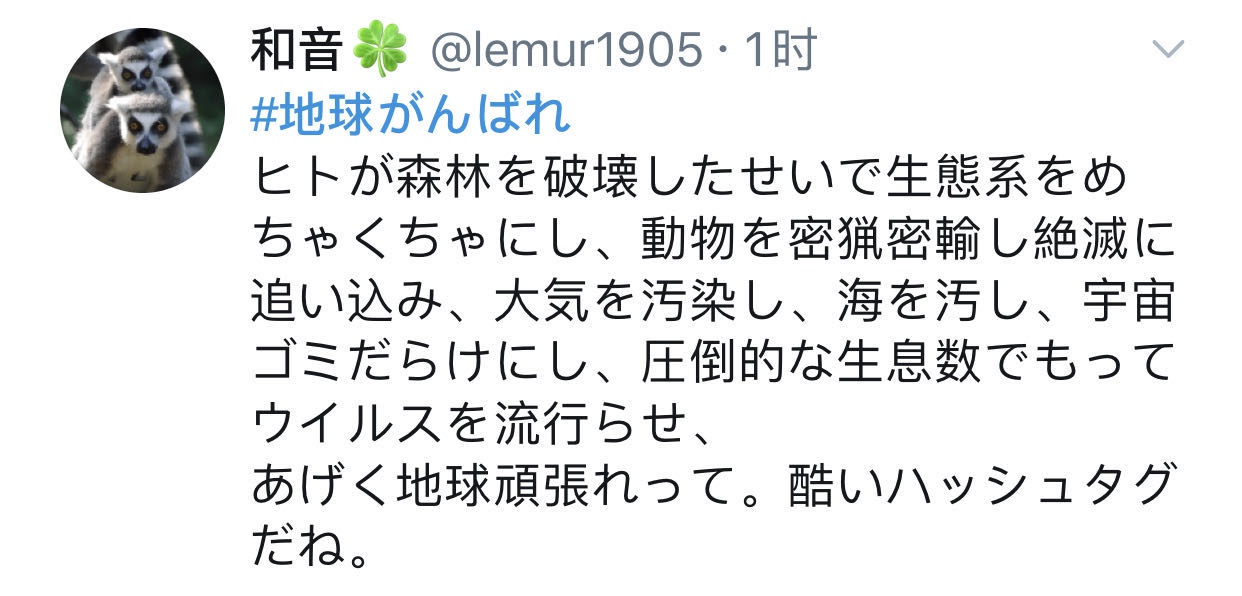 而网友“和音”认为,“人类破坏了森林,搞乱了生态系统,偷猎动物并导致物种灭绝,污染大气、海洋,甚至往宇宙丢垃圾……结果这时候却让地球‘加油’,真是过分的话题。”