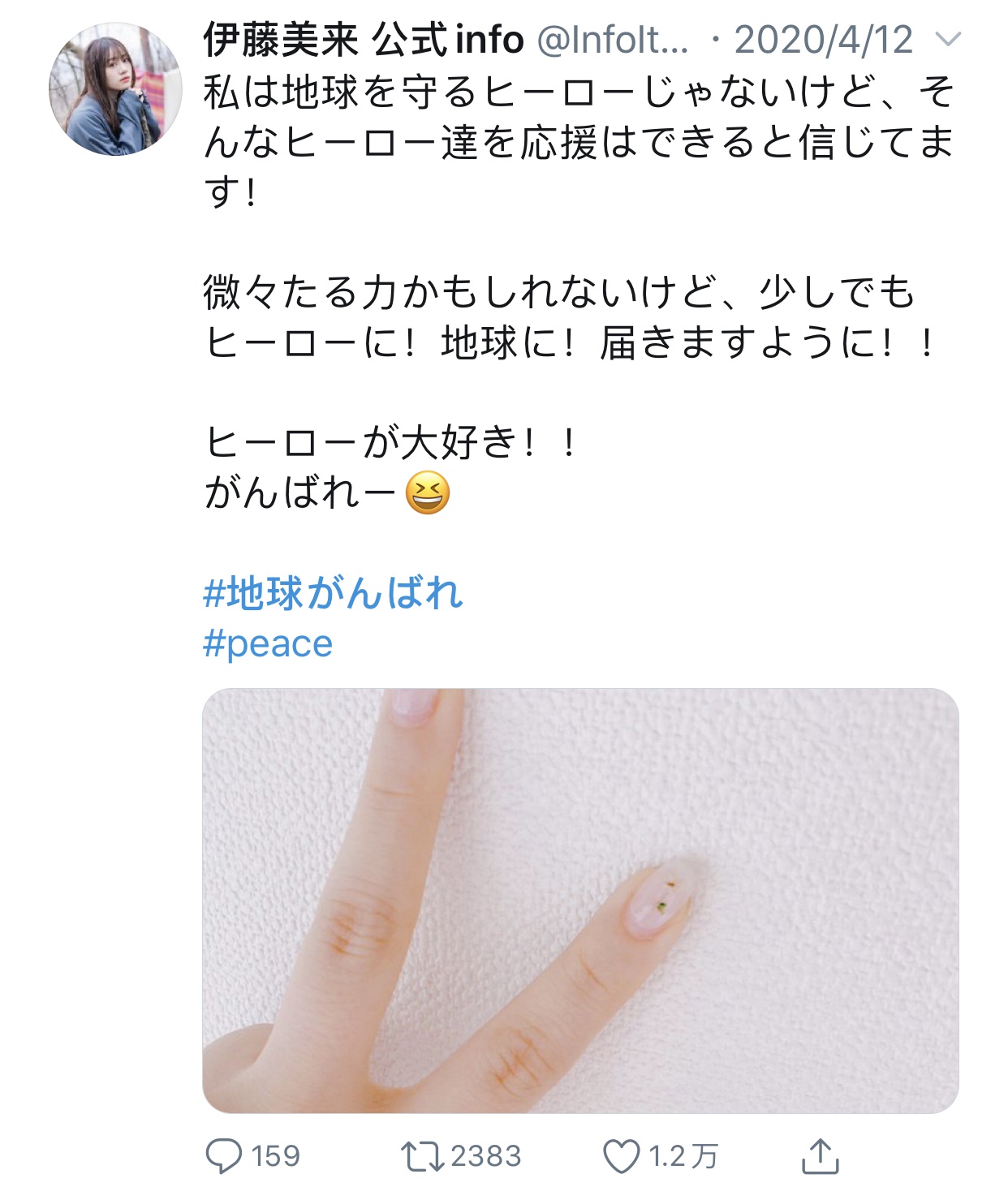 该提议一经发出就获得了5000多转推和上万赞,许多日本网友跃跃欲试。在上周六(11日),松本宽也正式提出“地球加油”的话题标签,次日就有许多网友带上标签跟进活动。有网友表示,“尽管我不是守护地球的英雄,但我相信可以声援那些(守护着我们)的英雄。尽管力量微薄,但就算只有有一点也好,希望能传达给英雄们、传达给地球!最喜欢英雄了!!加油!”