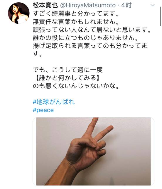 对此,活动发起者松本宽也解释了自己的初衷:“我明白这是非常华而不实的漂亮话,也许是不负责任的说法。想必没有人不在努力,我明白这种空话漏洞很多,也不能给任何人起到帮助作用。但是,我觉得像这样每周一次‘试试做些什么’也不是什么坏事。”此外,他还在推文中附了一张寓意为“和平”的手势,而这一手势也被很多参与话题的日本网友效仿,几乎成为该活动的标志性手势。