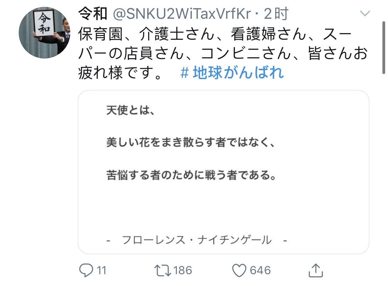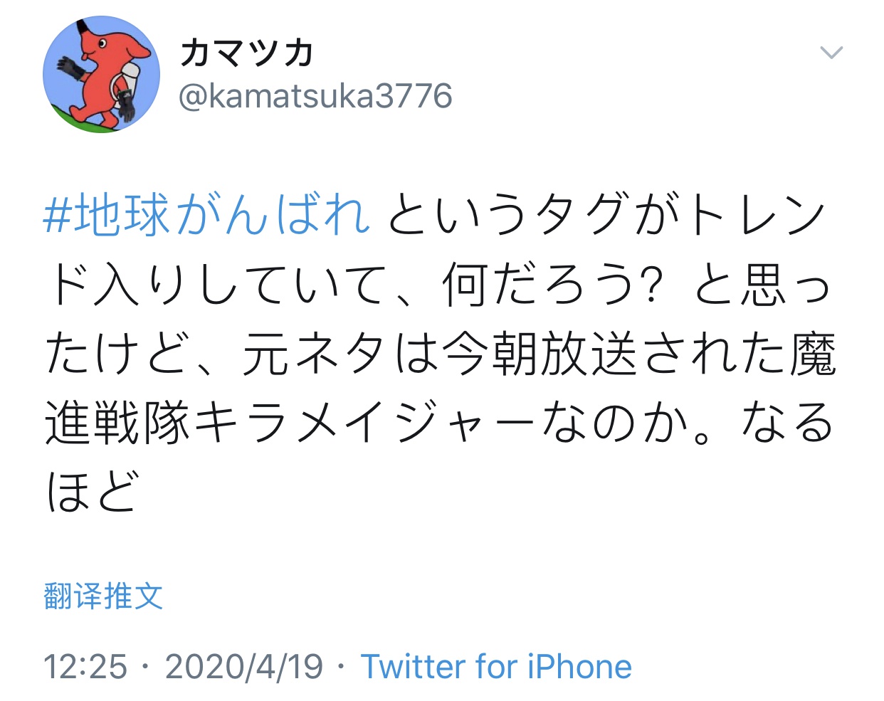 原标题:为“英雄”打气,日本网友将“地球加油”送上推特热搜 [环球网报道记者 崔舒飞]今天(4月19日),一些日本网友发现“一觉醒来,‘地球加油’就上了推特热搜”。不少人都不明就里地发推问“地球加油”怎么回事?为什么是“地球”加油? 原来,“地球加油”活动是由一名日本推特博主发起的“来自超级战队(源自日本东映公司的特摄电视剧)亲善大使的提议”。本月5日,日本推特博主松本宽也发文称,由于现在身边都是令人沮丧的消息,因此他提议网友每周日上午10点在推特中向地球发出“加油”的讯息,这样,“大家发出的‘加油’就可能传达给地球上正处在困境中的某个人。