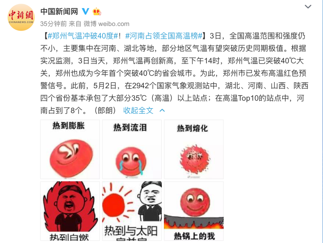 图片来源:新浪微博@中国新闻网 根据实况监测,3日当天,郑州气温再创新高,至下午14时,郑州气温已突破40℃大关,郑州也成为今年首个突破40℃的省会城市。为此,郑州市已发布高温红色预警信号。 此前,5月2日,在2942个国家气象观测站中,湖北、河南、山西、陕西四个省份基本承包了大部分35℃(高温)以上站点;在高温Top10的站点中,河南占到了8个。 值得注意的是,5月2日,中央气象台官方微博发文表示:“这两天的高温并非常态,随后会有冷空气来解救我们,最高气温会被打趴回20℃+。”