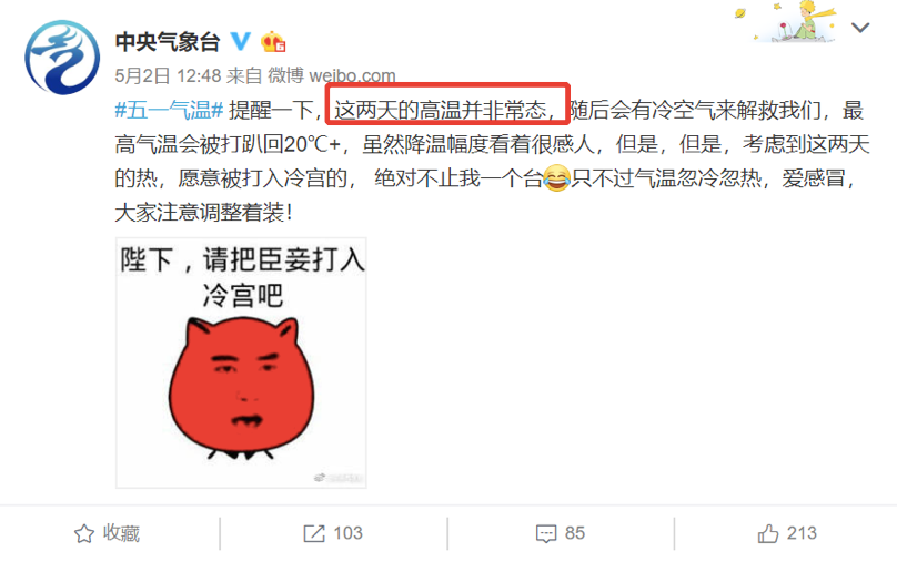 图片来源:新浪微博@中央气象台 5月3日,中央气象台发布重要天气提示称,“北方高温4日起减弱,南方强降雨在路上”。