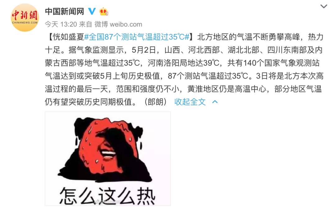 刚进5月,一连几天的高温天气让人喘不过气来。 据中国新闻网官方微博,气象监测显示,5月2日,山西、河北西部、湖北北部、四川东南部及内蒙古西部等地气温超过35℃,河南洛阳局地达39℃,共有140个国家气象观测站气温达到或突破5月上旬历史极值,87个测站气温超过35℃。