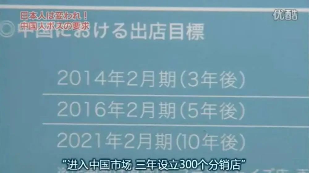 如意董事长邱亚夫――现在也是Renown最大的股东――喜气洋洋、笑容满面地再一次和日本高管强调一个事实:“向贵方进行这样巨大投资的人就是我们中国人,你们得认清楚这一点。”(这是纪录片的日文翻译,原话其实委婉很多,但显然听着的日本人就是这么理解的。) 但好景不长,进入中国市场的第一步就给予了日本人直击灵魂深处的震撼: 在初次会议上,邱董事长大手一挥:“在四个月之内开业一家迄今为止最大的店铺”。业绩目标也很明确:进入中国市场,三年设立300个分销店,十年设立最少2000个分销店。