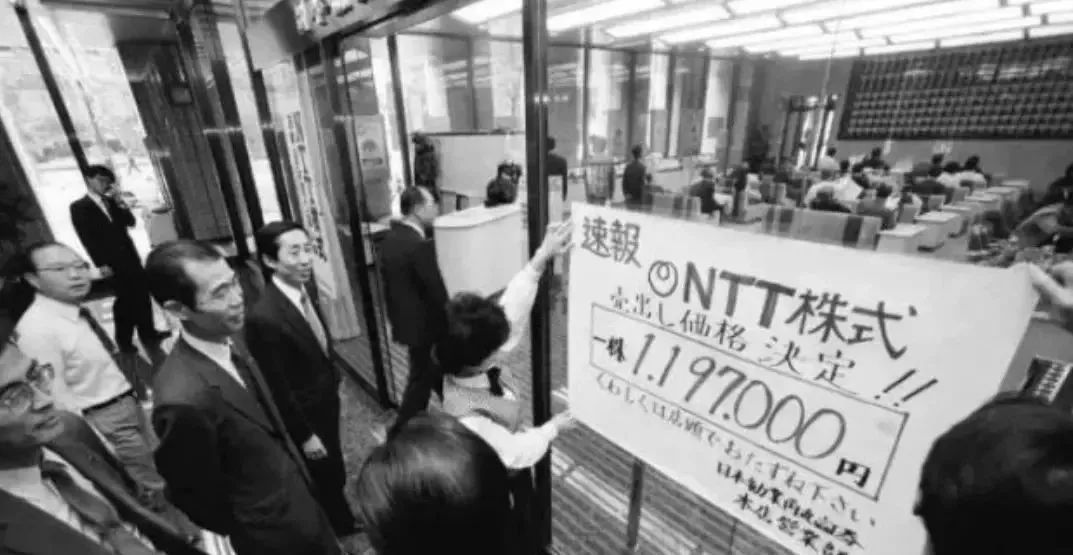 代表日本股票市场泡沫的就是日本电信电报公司NTT的上市。在当时电信电报就是全球商业模式最好的科技股,在大洋彼岸的美国,AT&T也是垄断着运营商市场,直到后来的分拆。日本电信电报公司最早是属于国有的,在1985年4月1日完成了民营改制。当时日本首相中曾根上台后,希望将日本的国有电信、国有铁路、国有商场等都完成私有化改制。这个制度下,首当其冲的就是NTT。1986年9月,日本大藏省决定把手上186万股NTT政府持股投入到股票市场,最初定价30-40万区间,却被爆炒到119万的新股价格,而且还是需要居民凭借身份证一人一股申购。到了当年的11月26日,居然有1085万人收购,差不多是10%的日本人口。当时老百姓的算盘很简单,中了新股稳赚不赔。一般上市后会上涨个30%,你只要中了一手,就能赚几十万日元,而当时日本家庭年收入也就350-400万日元。