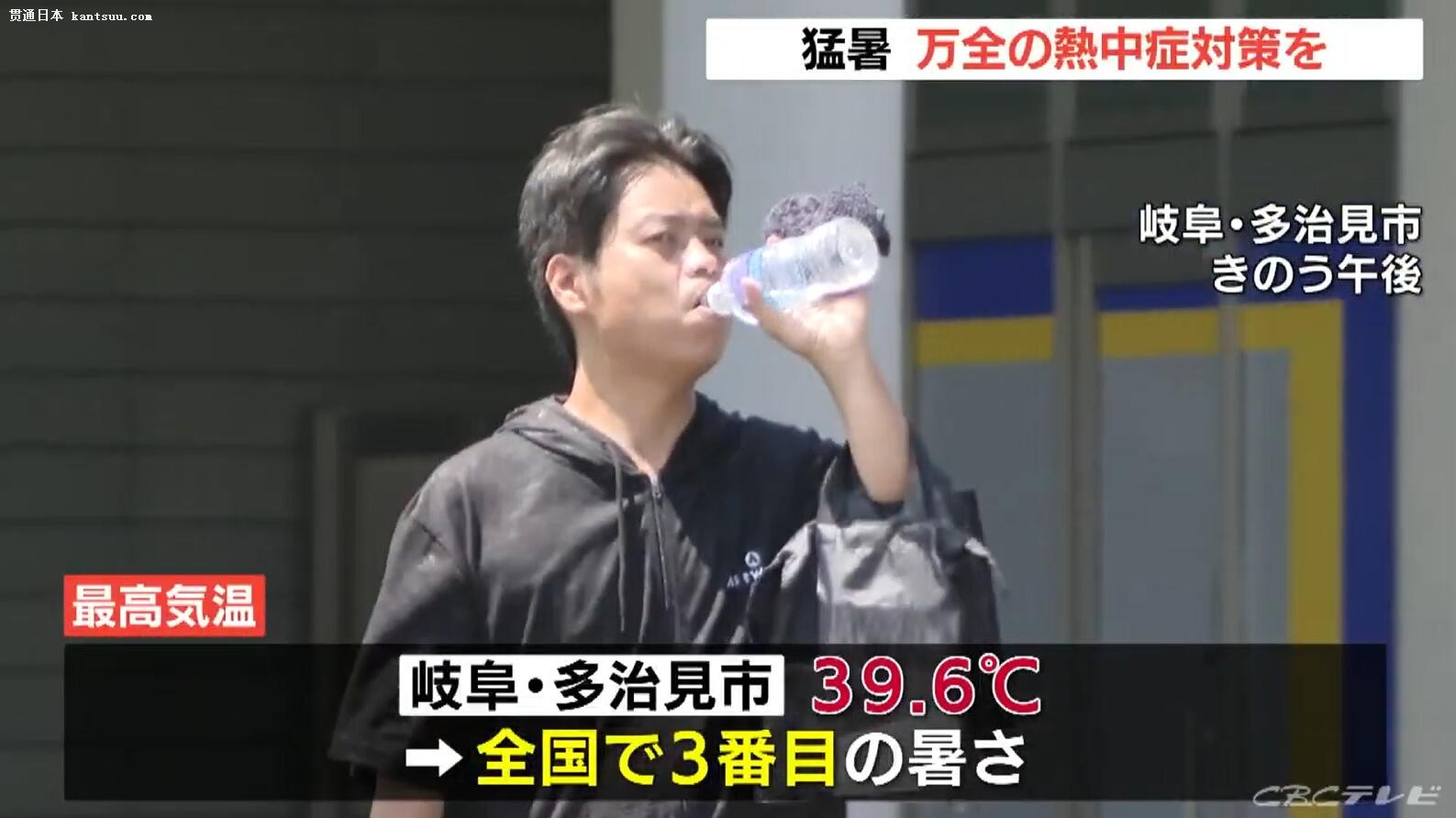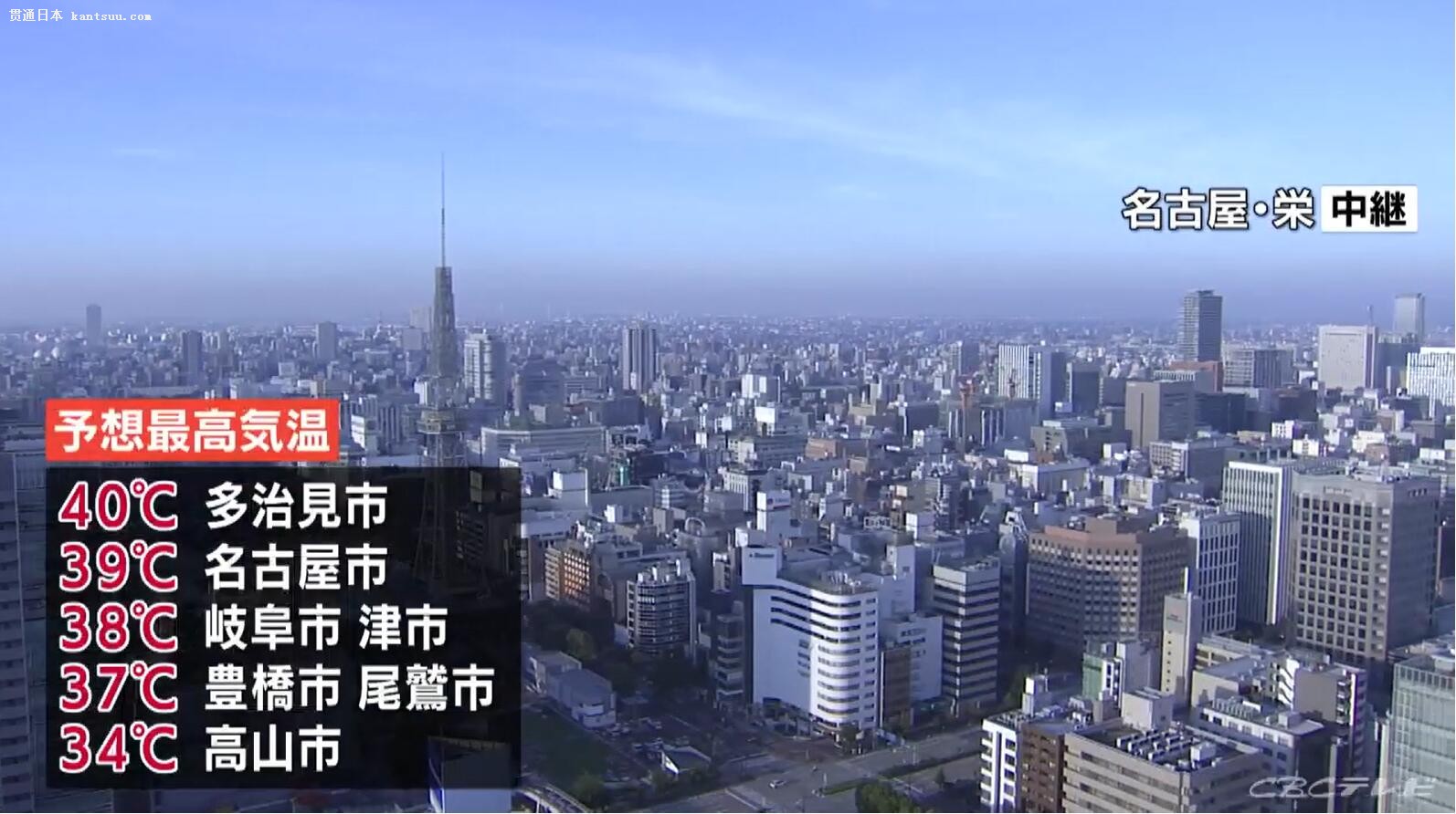 上图:17日,高温持续炙烤日本(电视报道截图) 据日本气象厅发布的消息,16日日本的最高气温出现在静冈县滨松市,高达40.9℃。除此之外,其他地方也陆续观测到今年的最高气温。地处中部地区的岐阜县多治见市观测到的最高气温达39.6℃,高知县四万十市西土佐达到39.4℃,山梨县甲府市为39.2℃,各地气温都到达了“危险”境地的暑热。 17日,气温并没有大幅下降,截止至当地时间今日早晨6点,神户市的最高气温为29.9℃、高知县室户岬为29℃、茨城县日立市为28.7℃。