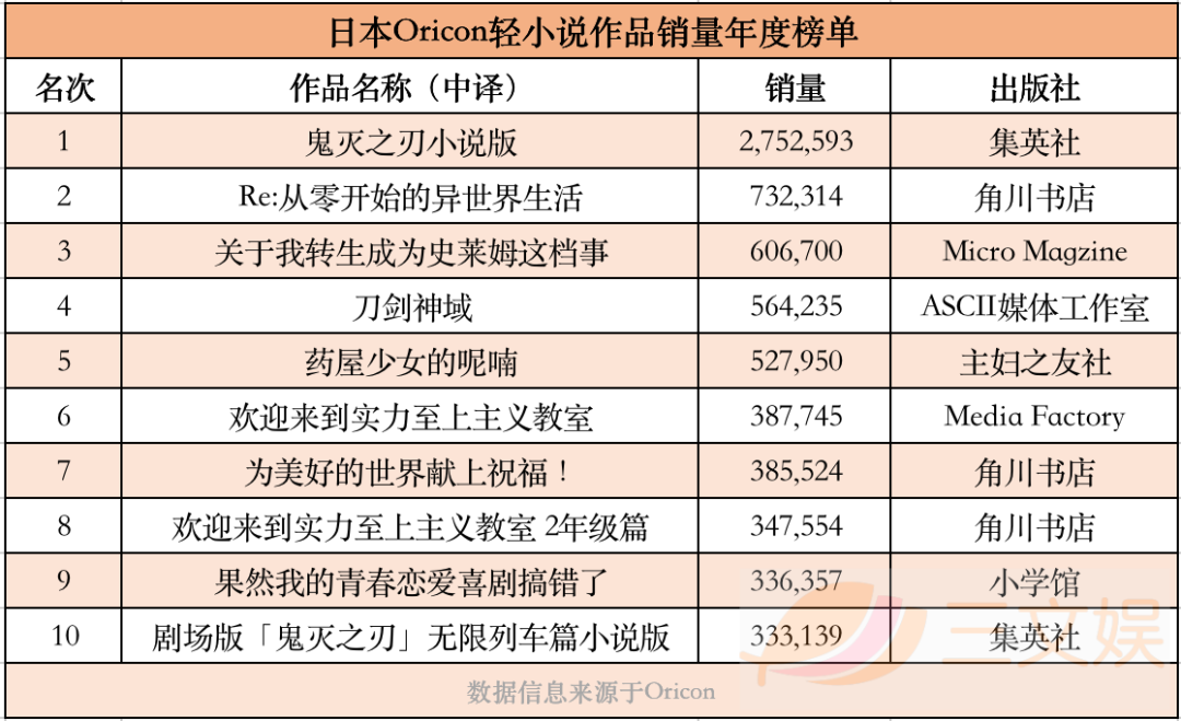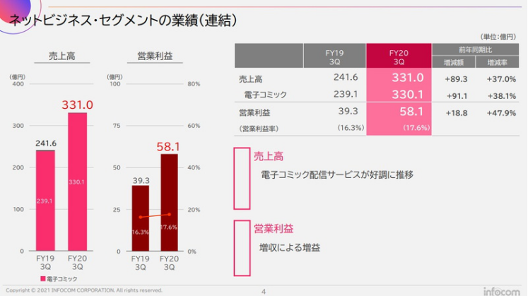 编者按:本文来自微信公众号“三文娱”(ID:hi3wyu),作者 トトロ,36氪经授权发布。 近日,日本全国出版协会和出版科学研究所发布了2020年度日本出版市场规模调查报告(注:仅本土市场),包含传统纸质出版物在内,日本出版物市场的销售额连续2年超过上一年。 报告显示,2020年日本国内的纸质出版物和电子出版物在2020年全年的销售额预计将达到1000亿元人民币(1.6168万亿日元),较2019年增长4.8%。 其中,电子出版物的销售额同比大幅增加28%,达到241亿元(3931亿日元),其中近9成为连载漫画类电子出版物,销售额达210亿元(3420亿日元),同比增长31.9%。而在2020年的整个出版市场中,电子出版占有率为24.3%,同比增长4.4%。 同比2019年,2020年纸质出版市场同比下降1.0%,电子出版同比增长28.0%且连续两年呈较大幅度的增长态势。 这背后的原因,有疫情影响下用户对书籍需求的增加也有《鬼灭之刃:无限列车篇》动画电影的热映,带动了相关纸质漫画、电子漫画,及相关小说、衍生轻小说、杂志等内容刊物的销售的市场因素。 受"鬼灭之刃"热潮带动,纸质销售额仅同比下降1% 2020年,纸质出版物(书籍、杂志合计)的推定销售额为1兆2237亿日元,较去年下降1.0%。 下降幅度较小的原因,是受集英社“鬼灭之刃"IP相关纸质出版物的爆发式畅销(包括漫画、周边衍生的小说,及杂志增刊等)及“王者天下”“海贼王”等IP相关作品的带动,抵消了其他纸质出版物的下降。 比如,“鬼灭之刃”IP相关的漫画。根据日本Oricon公信榜公布的2020年度漫画和轻小说作品的Top10销量榜《鬼灭之刃》漫画夺冠,年销量突破8000万部,是去年同期的7倍,是今年销量第二的《王者天下》销量的8倍。(扩展阅读:“鬼灭之刃”夺得双冠!日本漫画轻小说2020年度销量榜公布) 受益于《鬼灭之刃:无限列车篇》动画电影的热播,《鬼灭之刃》小说也强势“杀”入榜单,问鼎第一。 集英社对其进行了全方位运营加工,小说化改编的结果是理想的,《鬼灭之刃》小说集取得轻小说榜单第一,总销量275万册。除此之外,集英社还紧跟热度,将正在的热映的剧场版电影改编成轻小说,得益于电影的热播,小说作品也享尽了市场红利。 《剧场版「鬼灭之刃」无限列车篇》小说版在今年发售,但也强势挤进前十的榜单,居于畅销榜第十,销量33万。而在2019年,《天气之子》电影改变小说也获得轻小说榜单第二的位置。 实际统计区间为2019年12月2日至2020年11月30日 书籍方面,自2020年3月2日学校同时开启“停课模式”,参考书、儿童读物销量大幅增长,全年都呈现良好势头。此外,文艺、商务、计算机、游戏攻略类书籍销量赶超去年。 杂志方面,漫画单行本大幅增长了约24%,月刊杂志(包括漫画、杂志书)同比增长0.5%,实现自1997年以来第一次反超上年。周刊杂志同比下降8.5%,陷入苦战。月刊杂志中,期刊在3~6月相继中止、延期发售,大型刊物也接连暂时停刊,因此下降约9%。杂志书也较为低迷,下降约14%。 电子出版市场大幅增长 漫画3420亿日元占比超9成 2020年,电子出版市场较2019年同比增长了28.0%,销售额达到3931亿日元,取得大幅增长的好成绩(根据读者支付的金额推算出来的,不包括广告收入,杂志包含定额制的无限阅读服务)。 其中,电子漫画同比增长31.9%,为3420亿日元;电子书籍同比增长14.9%,为401亿日元;电子杂志同比减少15.4%,为110亿日元。漫画、书籍销售额的增长主要受新冠影响,因“蛰居需要”带来用户增加,客单价也随之上涨。 电子漫画方面,在爆红的《鬼灭之刃》和《异世界》系列作品及原创电子书作品的拉动下,大幅增长,成绩斐然。漫画占到电子市场的87%,较2019年增长2.6%。 电子书籍方面,因东野圭吾、凑佳苗等畅销作家的作品在2020年陆续实现电子化,呈现稳中向好态势。电子杂志方面,由NTT DOCOMO提供、市场占有率较大的无限阅读服务“d Magazine”,虽在早春一度控制了会员数的持续下降,但自夏季以来出现再次减少,连续3年减少2位数。 由此可见,虽然疫情对实体杂志的生产、发行带来部分影响,但因宅家阅读需求的攀升,加之2020年席卷各大榜单的现象级作品《鬼灭之刃》助力,日本出版行业一派欣欣向荣。 乘此东风,一众IT企业也在电子出版业务方面大展身手,第3季度决算财报成绩喜人。比如,ebook,Infocom corporation,Infocom。 1、ebook 日本大型电子书供应商eBook Initiative Japan于1月27日发布了2021年3月期的第3季度决算财报(2020年4-12月),与PayPay合作大获成功,销售额更新季度最高纪录。 其中,销售收入218.9亿日元,同比增长44.2%;营业利润8.65亿日元,同比增长63.4%;常规项目利润8.66亿日元,同比增长64.7%;最终利润6.9亿日元,同比增长68.9%。 2、Infocom corporation 日本大型IT公司Infocom corporation于1月27日发布了第3季度综合决算财报(2020年4-12月),销售额、利润均实现两位数增长。主力军电子漫画网站“めちゃコミック”持续成长。 其中,销售收入489.14亿日元,同比增长18.7%;营业利润71.1亿日元,同比增长22.0%;常规项目利润72.13亿日元,同比增长23.5%;最终利润49.25亿日元,同比增长23.9%。 Infocom的网络商务业务第3季度累计(20年4~12月)业绩,销售额同比增长37.0%,达到331.02亿日元,营业利润同比增长47.9%,达到58.15亿日元,收益实现大幅增长。 其中,由子公司运营的电子漫画网站“めちゃコミック”业绩良好,销售额同比增长38.1%,达330.1亿日元,占到网络商务业务销售收入的99.7%。不仅刷新了第3
