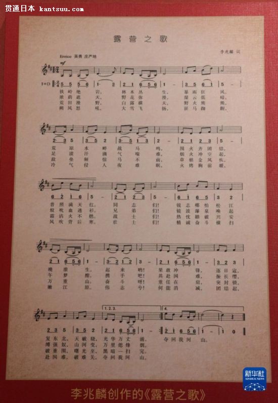 李兆麟创作的《露营之歌》。新华社记者杨青摄 《西征胜利歌》《露营之歌》……时光荏苒,透过一首首经过岁月洗礼的抗战歌曲,那段全民族不屈不挠的抗战史跃然纸上,人们仿佛置身于烽烟年代。 壮歌:新时代的澎湃潮声 湛蓝天空下,9月17日9时35分,G906次高铁列车从沈阳“九一八”历史博物馆旁飞驰而过。