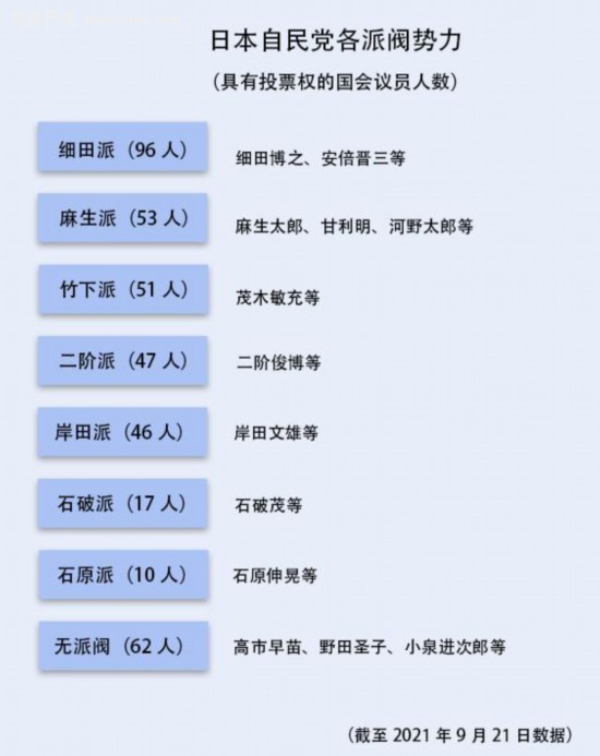 党首选举=首相选举? “首相”在日本全称为“内阁总理大臣”。根据日本法律,首相从国会议员中选举产生,由国会提名,天皇任命。一般而言,会提名在国会中占多数席位的执政党党首担任首相。目前,自民党在国会中占多数席位。10月4日,日本将召开临时国会,进行首相提名选举,新当选的自民党总裁将成为日本第100任首相。在自民党历代总裁中,河野洋平与谷垣祯一在任期间因自民党失去执政党地位,而没有成为首相。 据悉,本届国会众议院议员任期截至10月21日,下届众议院选举预计在11月举行。新任自民党总裁能否带领自民党守住席位,也是此次总裁人选的重要考量因素之一。 投票在即选情仍不明朗 目前,从民意调查结果来看,河野太郎暂时领先。每日新闻社与日本社会调查中心25日发布的全国民调显示,河野的支持率为45%,岸田与高市均为18%,野田为7%;FNN(富士新闻网)9月18日、19日进行的一项电话民调显示,52.6%的调查对象认为河野是自民党总裁最合适的人选,岸田的支持率为15.2%,高市为11.6%,野田为6.4%;ANN(全日本新闻网)20日发布的民调结果也显示,河野在四位候选人中人气最高,支持率为48%。 受舆论影响较大的是党员·党友票。国会议员票为一人一票,党员票是在全国党员投票基础上通过“最高均数法”计算得出。据悉,截至2020年底,日本自民党党员共约113万人。时事通信社的调查结果显示,与民意调查结果基本相符,目前河野在“党员·党友”中的支持率领先,岸田、高市紧随其后。 在国会议员方面,时事通信社26日公布的“自民党国会议员支持动向调查”显示与其他调查的排序略有不同,岸田的支持率超30%,河野支持率接近30%,高市超20%,野田在20位推荐人基础上难以获得更多支持。 制图:人民网记者 张丽娅 自民党内部派阀林立,目前最大的派阀为安倍晋三所在的“细田派”。在自民党史上,无派阀议员当选总裁、首相的只有菅义伟。通常情况,各派阀统一推举候选人,但此次因派阀内意见不一,大多数派阀决定采用“自主投票”。 “细田派”主要支持高市与岸田;河野太郎所属的“麻生派”,年轻议员支持河野的较多,而资深议员更倾向于支持岸田。“竹下派”会长竹下亘在9月17日自民党总裁选举发布公示的当晚去世,派阀走向不定,支持河野、岸田、高市的均有;“二阶派”支持河野、高市的较多;“岸田派”基本意见统一,支持岸田。“石破派”15日表示石破茂不参加选举,支持河野太郎。据报道,目前约15%议员尚未明确态度,选情仍然充满变数。