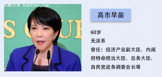 制图:人民网记者 张丽娅 岸田文雄的父亲和祖父都曾是国会议员。自早稻田大学毕业后,他曾在日本长期信用银行工作5年,之后担任身为众议院议员的父亲的秘书。父亲去世后,岸田文雄接任,1993年当选众议院议员。同期当选的还有安倍晋三、高市早苗、野田圣子等。2012年岸田就任自民党最古老的派系“宏池会”会长,即“岸田派”。 岸田在2012年12月第二次安倍政权时期被任命为外务大臣,任期4年8个月,为日本二战后连续在任时间最长的外务大臣。任职期间日韩就慰安妇问题达成协议,实现美国总统奥巴马访日等。2017年7月,时任防卫大臣稻田朋美辞职,岸田文雄临时兼任防卫大臣一周,开创了日本宪政史上外务大臣兼防卫大臣的先例。 岸田曾数次冲击自民党总裁选举,2018年“岸田派”希望他出马,最终岸田决定支持安倍连任。2020年9月,岸田文雄在与菅义伟的竞争中失利。一年之后的9月17日,他在竞选启动演讲中说道:“去年总裁选举我失败了,是我能力不足,之后我倾听了多方声音。现在站在这里充满信心,我坚信,这个时代需要的领袖是我”。 岸田在本次自民党总裁选举中针对疫情、经济发展和外交安保均提出相应政策。在经济方面,他提出“新日本型资本主义”,强调构建“发展与分配的良性循环”,加强对中产阶层的支持,提高儿童教育费用、居住费用补助。 高市早苗:“早苗经济学”三支箭