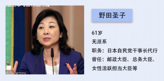 制图:人民网记者 张丽娅 早在今年8月10日,高市早苗就在《文艺春秋》上发表文章《出马,总裁选举!》,透露参选意向,介绍其政策构想“日本经济强韧化计划”。9月8日高市正式宣布参选,前首相安倍晋三在推特上明确表示“支持高市早苗成为候选人”。 《朝日新闻》报道称,高市能够得到20个推荐人,获得竞选资格,离不开安倍的支持,高市的政策主张也具有明显的“安倍色彩”。高市早苗提出“早苗经济学”,即通过日本强韧化计划重振经济。与安倍经济学相同,“早苗经济学”也包括“三支箭”: 宽松的货币政策、紧急情况下灵活的财政政策和大胆的危机管理投资和成长型投资,目标为安倍提出的2%通胀目标。高市也同样主张修宪。 野田圣子:“内阁女性比例提高至一半”