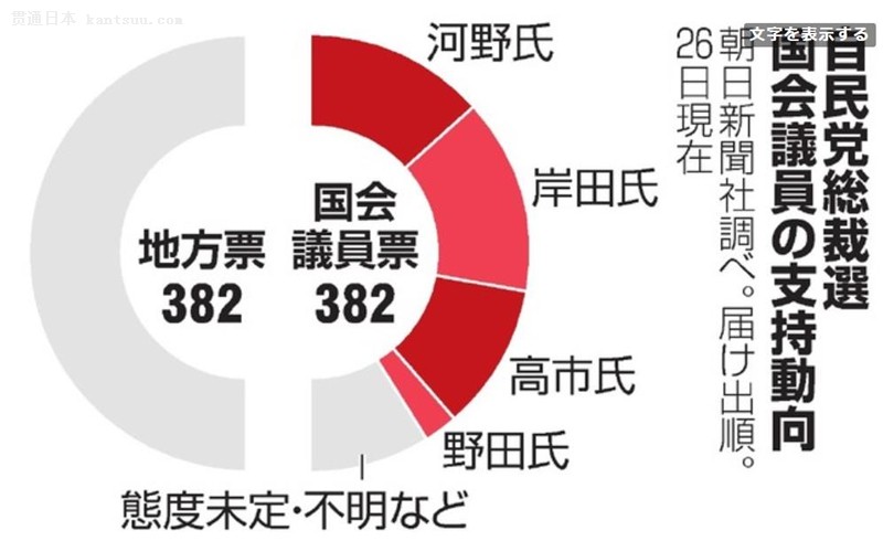 人民网东京9月28日电(李沐航)据《朝日新闻》网站报道,日本自民党总裁选举将于29日进行投开票。据了解,在自民党的382名国会议员中,支持该党前政务调查会长岸田文雄的超过110人,支持日本行政改革担当大臣河野太郎的国会议员超过100人,两名候选人在支持率上的竞争十分激烈。而支持前日本总务大臣高市早苗的国会议员超过80人,紧随其后;支持自民党代理干事长野田圣子的预计仅有她的20名推荐人以及其他少数国会议员。