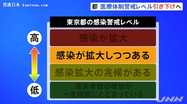 专家组会议负责人、日本国立传染病研究所所长脇田隆字。(图片来源于NHK电视台截图) 此外,针对未被纳入疫苗接种对象的12岁以下儿童的新增确诊病例数占比增加的情况,脇田隆字表示,新学期开学至今,儿童新增确诊病例数并未出现明显增长。儿童新冠患者大多数是被父母传染,只有成人彻底做好防疫工作才能解决根本问题。脇田隆字表示:“加快疫苗的接种进度,也是为了更好地保护儿童。” 此次专家组会议上公布的资料显示,截至10月5日的最近一周新增确诊病例数为上一周的0.53倍,日本全国的新增确诊病例数已连续1个月以上呈下降趋势。 东京都医疗体系警戒级别下调1级 东京都政府7日召开的疫情形势分析会议决定,将当地的医疗体系警戒级别由最高级下调1级。这是自2020年12月17日以来,东京都时隔10个月首次下调医疗体系警戒级别。