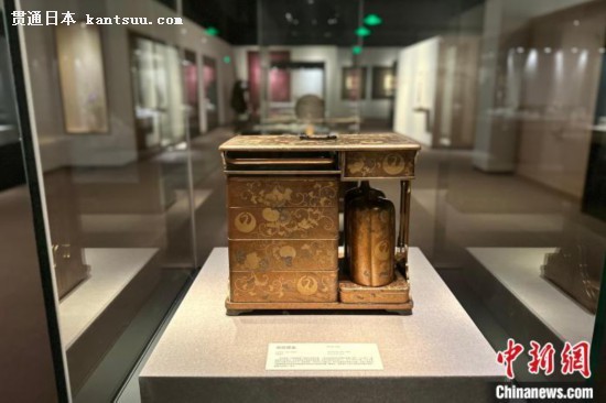 莳绘提盒。 中新网记者 王笈 摄 “花鸟风月”单元展陈有漆器、莳绘技法制作的物品。当中国漆器已进入黄金时代时,日本漆艺才刚刚起步。莳绘漆器是日本最具代表性的漆器之一,由于加入了描金银的技法,增强了其艺术表现力和视觉文化冲击。在中国漆文化的影响之下,莳绘技法在平安时代日趋成熟,在江户时代达到巅峰。 展厅中的一件莳绘提盒夺人眼球,用金莳绘华丽地装饰着一圈菊花、银杏的叶子和代表家族纹章的仙鹤,是婚礼家具的一部分。食品提盒是由漆木制成的便携式野餐工具包,由小盘子、清酒瓶和可容纳四五份食品的分层食品盒组成,并且全部固定在架子上。在江户时代中期,日本人去参加赏樱花、中秋节等季节性聚会或庆祝节日,都会带着食品提盒去野餐。