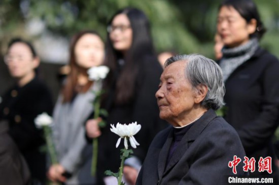 4月4日,南京大屠杀幸存者夏淑琴参加清明祭仪式。 中新社记者 泱波 摄 灰色厚重的“哭墙”上,黄白色菊花围成“奠”字。工作人员敬献花篮,全体人员向南京大屠杀死难者行三鞠躬礼。 “只要身体允许,我每年都来。”在家人的搀扶下,年逾九旬的南京大屠杀幸存者夏淑琴走到“哭墙”前,凝视着墙上七位家人的姓名,眼中含泪。1937年冬,夏淑琴一家九口人中的七口人被日军残忍杀害。当时只有8岁的夏淑琴和她4岁的妹妹夏淑芸侥幸活下来。夏淑琴被日本兵用刺刀刺中,至今身上留有伤疤。