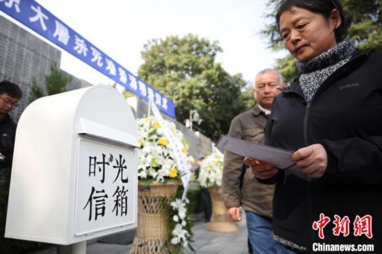 4月4日,南京大屠杀死难者遗属代表将写给遇难亲人的信投入时光信箱。中新社记者 泱波 摄 清明祭仪式末尾,南京大屠杀死难者遗属代表将写给遇难亲人的信投入时光信箱,寄托哀思,祈愿和平。(完) |