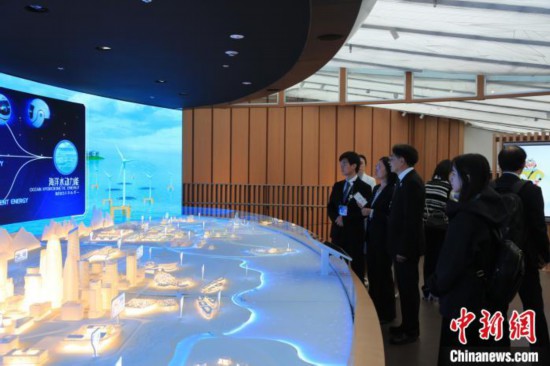 4月13日,2025年大阪·关西世博会(大阪世博会)正式开园,以“共同构建人与自然生命共同体——绿色发展的未来社会”为主题的中国馆当天举行了开馆仪式。图为参观者在中国馆内参观“八网融合”智慧城市沙盘展项。中新网记者 朱晨曦 摄 “智慧城市”展项现场负责人、中国能建品牌部总经理熊瑛对记者表示,展项的这些科技颇具“未来感”,比如在千米高空用“风筝”发电、在地下深处压缩空气储能,以及零碳建筑等,这些都让各国游客对中国的前沿科技赞叹不已。“展项整体展现的是在八网融合支撑下未来智慧城市的美好图景。我们特意设置了海洋能源一体化内容,日本作为岛国对于海洋能源很重视,可以为其提供借鉴。对于清洁能源可持续利用,在全世界都是一个共识和发展方向。希望越来越多的游客能够看到中国为全球可持续发展作出的贡献。” 此外,在“生生不息”展区内,“神舟十九号”航天员蔡旭哲、宋令东、王浩泽在天宫空间站通过视频送来祝福;“蛟龙号”体验舱中“载人深潜英雄”唐嘉陵下潜至7062米拍摄到的珍贵影像清晰可见;AI大模型邀请中国文化中最受欢迎的神话人物之一“孙悟空”用多语种品古论今,写诗作画,吸引不少观众前来与之互动。中国馆还展示了嫦娥五号、嫦娥六号从月球带回的土壤样品,这是中国馆在本届世博会上献给全球观众的一份最珍贵展品。