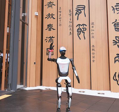 在日本大阪世博会,人形机器人在中国馆外向嘉宾招手致意。新华社记者 贾浩成摄